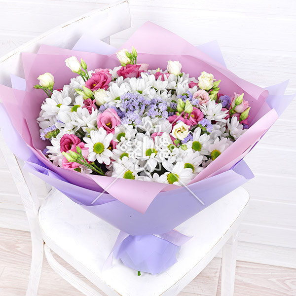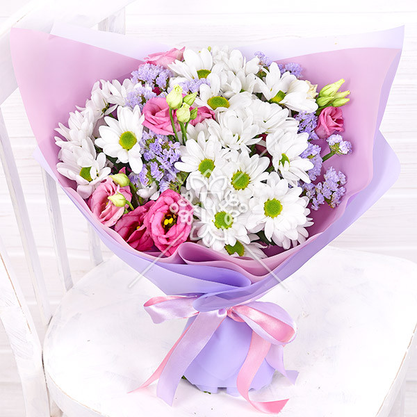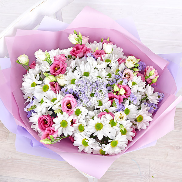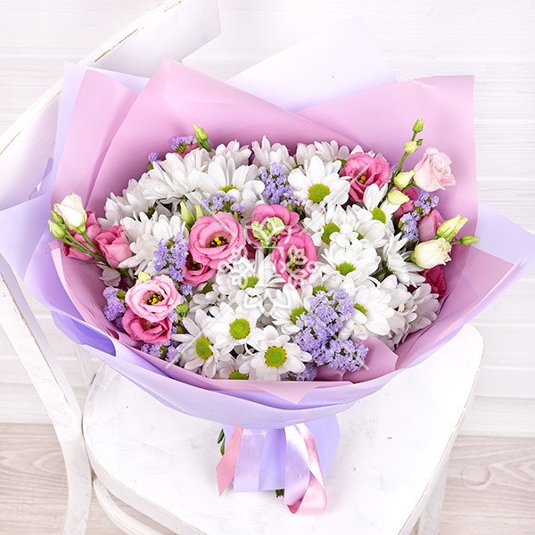 хризантема белая кустовая – 3 шт., эустома розовая – 4 шт., статица светло-фиолетовая (фиолетовая) – 1 шт., упаковка, лента.